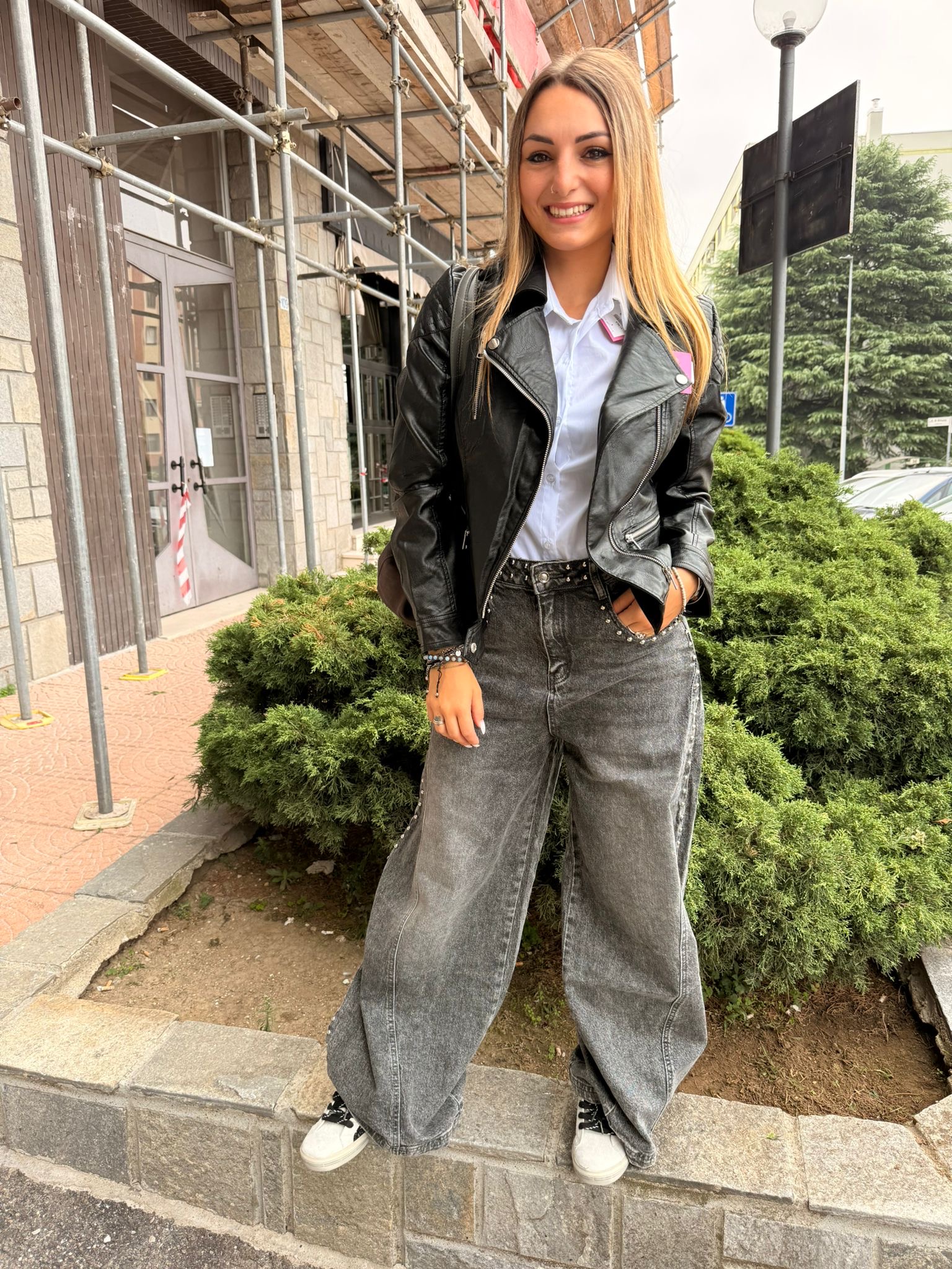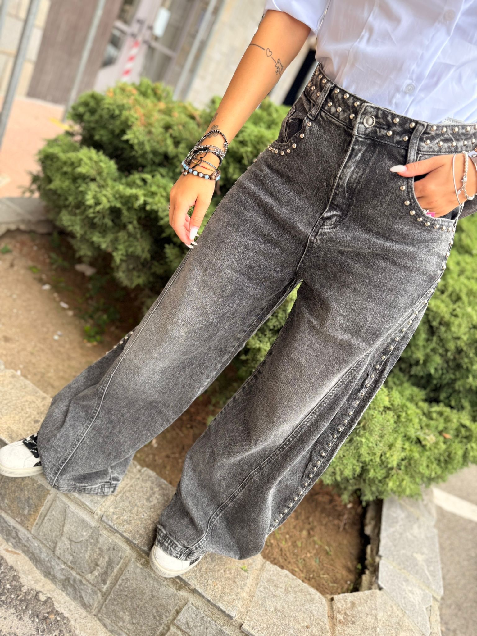Jeans color grigio modello ballon con borchiette. Dalla XS alla L .